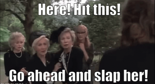Remember that scene in Steel Magnolias, after the funeral? After Sally Fields character has just buried her daughter, and sobs and breaks down in grief and anger, and says she just wants to hit something? And then Olympia Dukakis’ character does this?